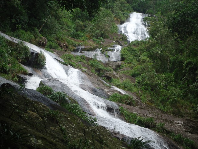 A expedição não havia terminado, muito porque ainda tínhamos mais de um km de rio e cânions para descer até o nosso acampamento, mas cada um já estava ciente de que havíamos agora de completar todo o nosso planejamento. Despedimos-nos da GRANDE CACHOEIRA DO ALTO AREADO , atravessamos o rio para o lado direito de quem desce e começamos a perder altitude, nos valendo de um corredor mais aberto até vinte minutos a baixo voltarmos novamente ao rio para apreciar mais uma queda de uns 60 metros, justamente aquela que tivemos que ir escalando pelo lado esquerdo do rio. Verdade mesmo que tudo fazia parte de uma parede extraordinariamente gigante, que quase formava uma só cachoeira. Continuamos descendo até a base dessas paredes aonde encontramos um patamar e lá nos instalamos para apreciar mais um espetáculo de águas despencando de cima das pedras onde no topo, uma cachoeira de uns 50 metros emendava com mais uns 50 de paredes. Esse nos pareceu ser o final das grandes cachoeiras da parte superior do Alto Areado, que juntando com a cachoeira mais próxima da confluência, formavam assim um total de quatro grandes quedas d’água gigantes, num dos roteiros SELVAGENS mais incríveis de Ilha Bela.