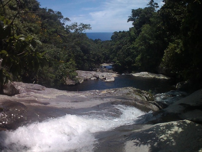 Ninguém queria ir embora daquele lugar, mas ainda tínhamos uma caminhada longa até Borrifos, onde estava o nosso carro. Fomos descendo, mas dessa vez ninguém quis mais abandonar o rio, eu mesmo fui me atirando em tudo quanto é poço e de cima das pequenas cachoeirinhas, dava para ver o azul do mar, se contrastando com o verde da floresta, numa visão realmente muito bonita. Quando chegamos de volta à ponte pênsil, aonde uma galera que voltava da Praia do Bonete estava, todo mundo olhou espantado para o nosso grupo e ninguém entendeu nada do que estava acontecendo e ficaram surpresos ao saber que havia malucos que vararam mato por três dias, subindo o rio para procurar algo que eles nunca ouviram falar.