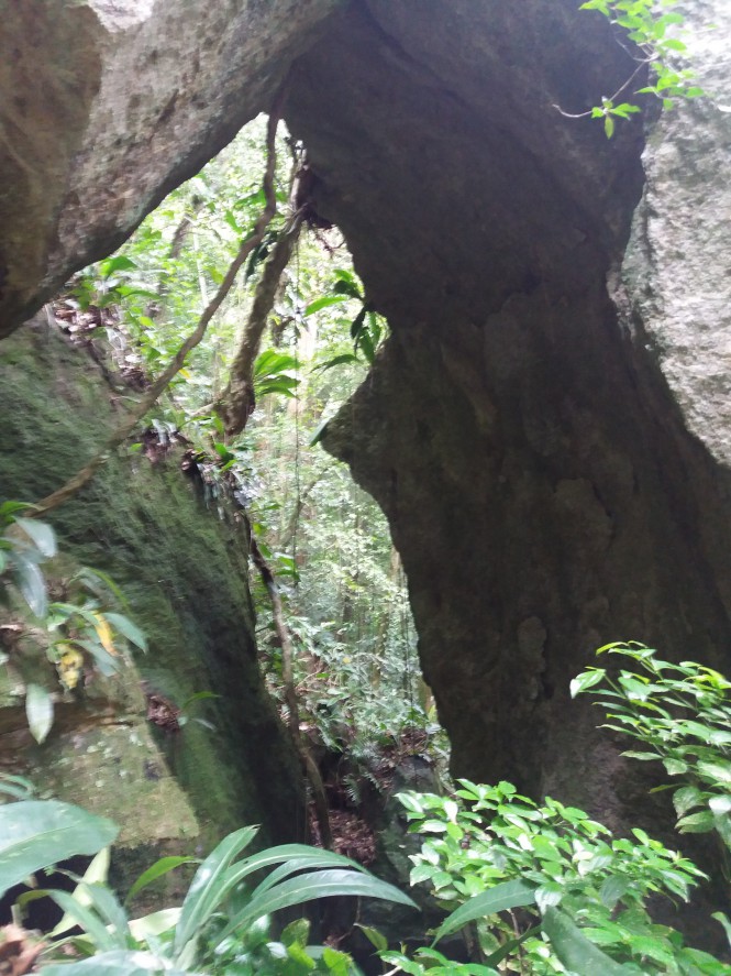 Portanto, subimos o barranco e avançamos muito rapidamente ao encontrarmos uma vegetação mais espaçada, que só se fechava quando tínhamos que descer para cruzarmos os inúmeros afluentes. Achar essa rota foi realmente sensacional porque acabou nos economizando umas três horas de pernadas e mesmo a gente tendo encontrado umas passagens com alguns amontoados de pedras, inclusive formando arcos rochosos, mesmo assim foi um caminho feito na metade do tempo de ida. Mas ao chegarmos ao rumo de onde estavam os grandes poços e a cachoeira do Escorregador, apontamos nosso nariz para lá e jogamos nossas mochilas ao chão para mais uma rodada de ócio, brincadeira e descontração infantil, onde todo mundo resolveu se atirar na água e saltar de cima das pedras e escorregar na tal cachoeira.