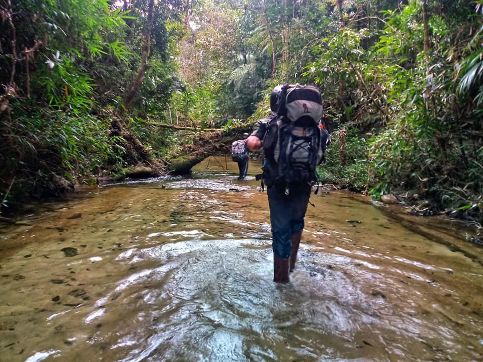 Abandonamos, portanto, a grande queda d’água e voltamos a subir esse tributário do Rio Claro e quanto chegamos a um girau de caça o rio deu uma curvada e se abriu numa sequência de cachoeirinhas e degraus. Até então não sabíamos se esse rio realmente iria continuar seguindo para sul, mas enquanto ele nos favorecesse, seria o nosso guia, mesmo que fizesse muitas curvas porque ter um caminho livre de mato, bambu e cipó seria ouro no meio daquela floresta fechada. Os degraus foram aumentando e as cachoeiras se multiplicando até que o rio se estabilizou de vez e começou a subir suavemente, com a água hora pela canela, hora pela cintura, mas como a temperatura havia caído e o sol havia deixado de dar as caras desde as onze da manhã, a água gelada começava e incomodar e quando podíamos, fugíamos pela margem para evitar a friaca.