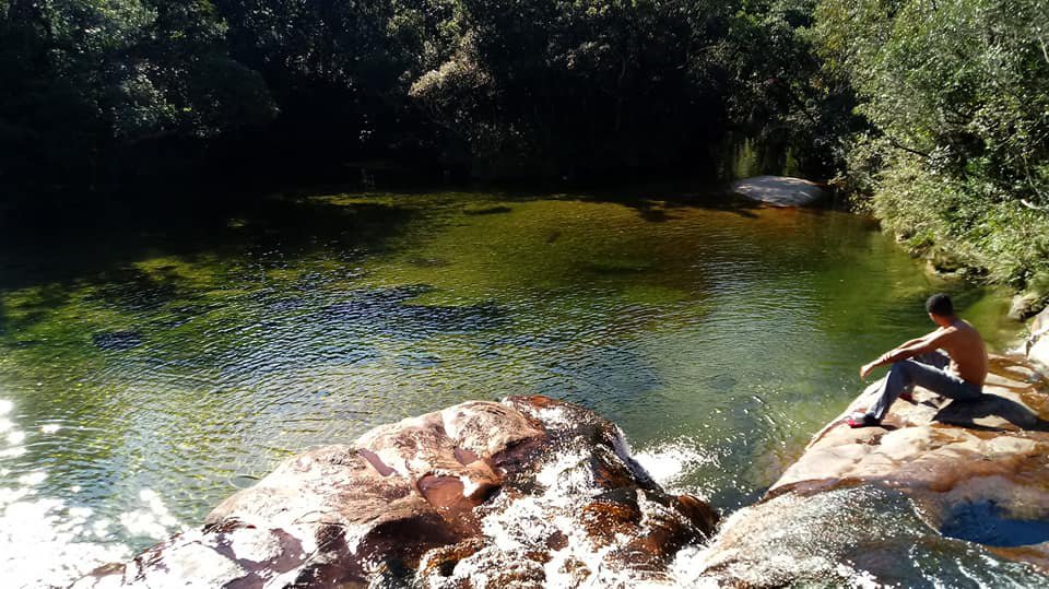 Alguns corajosos, movidos pela novidade da paisagem, resolveram se jogar nos poços, mas outros queriam mesmo era distância da água fria. Seguimos, mas agora com o grupo dividido entre os que se aventuravam pela água e os que comiam capim, tentando escapar do rio emparedado até que todos se juntaram em um grande poço, um espetáculo formado de água represada que de tão bonito, os meninos o compararam aos rios da Serra da Canastra e por isso vou chamar aqui de POÇO CANASTRA para marcar território. Ficamos ali, diante daquele lugar incrível, batendo papo e nos aquecendo ao sol e aproveitando para dar uma forrada no estômago, enquanto assistíamos alguns se jogarem na água e quando resolvemos partir, dividimos novamente o grupo, mas sempre nos mantendo visíveis e quando o rio voltou a ficar raso , voltamos todos a nos encontrar onde finalmente o Ribeirão do Campo se joga de vez de cima de um cachoeira e vai morrer suavemente no GRANDE LAGO que domina aquelas paragens, com quilômetros de tamanho, um gigante no meio da selva.