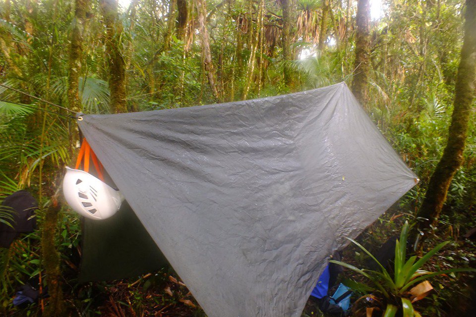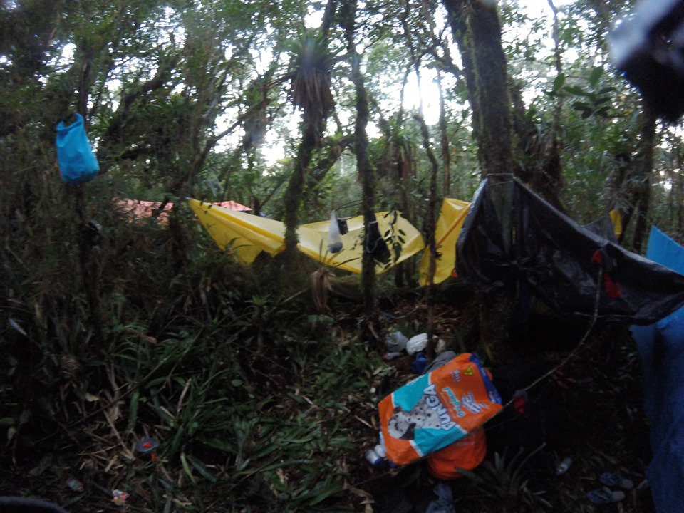 Enquanto o grupo se unia para conseguir um lugar abrigado e descente para todos, eis que que surgem 2 desertores, traidores do movimento montanhista e travessias selvagens na serra do Mar Paulista. Daniel Trovo e Rafael Araújo, abandonaram o grupo e mancomunados um com o outro, resolveram que montariam suas redes individuais, se valendo de um ou outro arbusto perdido na vegetação rasteira. Enquanto o alto comando (que não existe) assistia perplexo a traição sorrateira e covarde, voltamos a nos concentrar no abrigo. Em meio a um canto quase que beirando o abismo voltado para a face leste, nos concentramos na limpeza de uma área, retirando pequenas raízes no intuito de deixar o chão com possibilidade de podermos ter uma noite de sono razoável. Feito o trabalho, jogamos as lonas por cima dos arbustos e as amarramos, formando assim uma grande tenda para abrigar 06 exploradores. Jogamos uma grande lona no chão para isolar do frio e cada um escolheu seu canto e ali montou sua cama se utilizando de sacos de dormir.