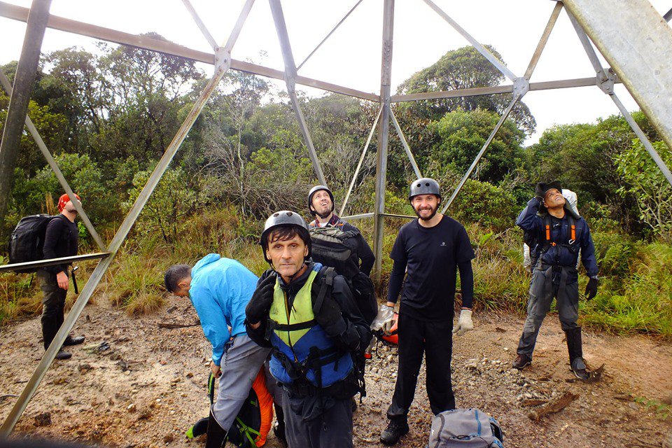 O dia amanhece sem chuvas, mas ainda com muitas nuvens. Desarmar o acampamento é uma coisa lenta e vagarosa, ninguém parece querer sair da rede quentinha e só lá pelas nove da manhã é que nos animamos a partir. A primeira coisa a fazer é localizar uma grande torre de Alta Tensão que pelos nossos cálculos não estava muito longe, já que agora bem visível sobre nossas cabeças passavam os fios de eletricidade, bem altos, mas mesmo assim ainda visíveis por entre as grandes árvores. Bastou um vara-mato despretensioso e logo a tal torre nos saltou aos olhos, reinando sobre uma pequena colina verdejante e desprovida de árvores e foi para lá que seguimos, agora no aberto e enfim com um pouco de horizonte e sol para nos alegrar a alma. Chegar a TORRE foi um marco, uma virada no ânimo da equipe. Subimos alguns metros, mas nem era preciso, do chão mesmo agora era possível avistar toda a imponência da cadeia de montanhas de onde a Pedra da Boracéia reinava absoluta ainda com seu topo sendo varrido por nuvens de algodão.