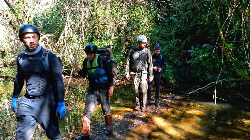 O tempo foi passando, o rio curvando para todo lado, mas sempre se mantendo para o sul. A temperatura caindo vertiginosamente conforme a tarde foi se aproximando e a sensação de que nunca chegávamos a tal Linha de Transmissão foi aumentando. Eu mesmo com uma camisa de neopreme sofria e gastava energia preciosa para fugir dos poços mais fundo porque a margem do rio era feita de bambus entrelaçados que dificultava o avanço. As vezes fazíamos algumas paradas para mordiscar alguma coisa, mas a retomada da caminhada era lenta e sofrível por causa do esfriamento dos músculos. O moral do grupo estava baixo, ninguém conversava mais, era nítido o sofrimento estampado no rosto de cada um e finalmente quando o Rio do Alegre cruzou a tal LINHA DE ALTA-TENSÃO e o nosso gps marcou a hora de virar para OESTE, o que estava ruim se transformou em pesadelo.