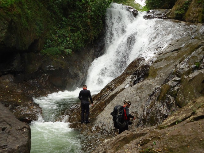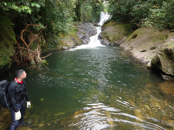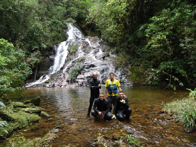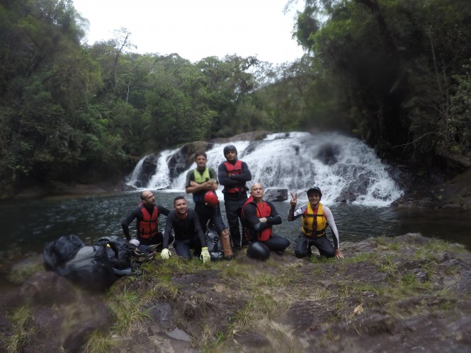 Depois de descermos por mais uma garganta estreita e escorregadia, num estudo rápido, já percebemos que descer pela esquerda poderia ser o caminho mais ideal, mas foi uma descida um tanto exposta e quando chegamos aos pés delas alguns não aguentaram e tiveram que ir se banhar perto da sua queda, uma cachoeira com salto bonito que depois corria por uns 80 metros até cair em mais um poço esverdeado e profundo e para não perder o costume, sr. Trovo , um espécie de Aquaman tupiniquim já inaugurou mais um salto de cima da queda e foi parar de novo no fundo do rio e como ninguém queria ficar fora da diversão, um a um fomos nos livrando das nossas mochilas e pulando também: Meu Deus, a vida poderia ser feita só de saltos !