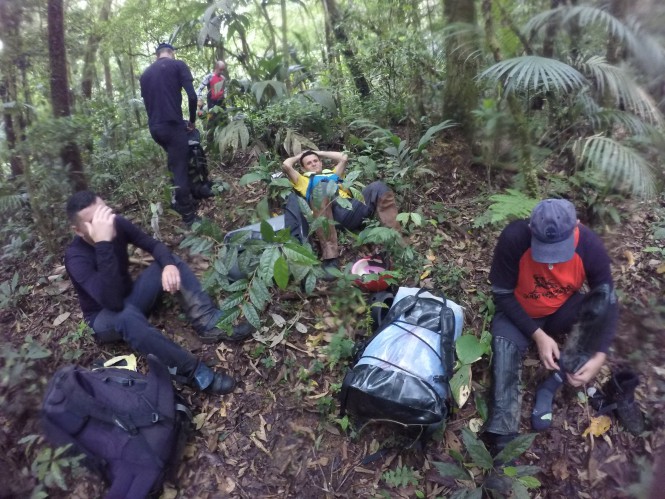 Nas discussões fervorosas antes da expedição, havíamos chega à conclusão de que ao nos posicionarmos no ponto onde estávamos, conseguir descer até o Vale do Bracinho seria tranquilo, era só ganhar uns 500 metros de montanha varando mato e já começar a descer, mas de repente começamos a rodar em círculos e quanto mais andávamos mais nos víamos perdidos no meio da floresta, mesmo com dois gps em operação. Acontece que quando ganhávamos um terreno favorável nos empolgávamos e esquecíamos de ir acompanhado a progressão no gps e quando víamos já havíamos andado muito para o lado errado. Corrigíamos a direção e voltámos a nos empolgar, tanto que em um certo momento caímos na calha de um afluente e demos como certo ser um tributário do Bracinho e fomos descendo feitos umas bestas cegas até que alguém gritava que novamente estávamos indo para o lado errado e tínhamos que corrigir o rumo novamente, ás vezes tendo que voltar a escalar os barrancos e enfrentar bambus no peito para desespero do Décio que já arrastava 100 m de língua no chão. O tempo foi passando e a previsão de alcançar o rio principal antes do meio dia já havia se esgotado faz tempo. Mais um morro foi subido e a tal da bandeirinha(plotada no mapa) que assinalava a descida para o rio nunca que era encontrada O Décio continuava como cu de tropa e de longe xingava a mãe de todo mundo, “Pitoco véio”( apelido que eu chamava carinhosamente um dos integrante) só fazia dar risada, ainda que ele fosse o desgraçado também responsável pela navegação, eu e Trovo que seguíamos de perto o outro navegador, tentávamos ajudar, mas teve uma hora que tivemos que dar uma basta porque já havíamos rodado mais que pião da casa própria , então nos juntamos com o Anderson Rosa e decidimos não desgrudar o olho do gps até que a bandeirinha dos infernos fosse localizada e quando a encontramos foi hora de dar uma parada para respirar um pouco e esperar que todo o grupo se juntasse novamente, comesse alguma coisa para a cartada final.