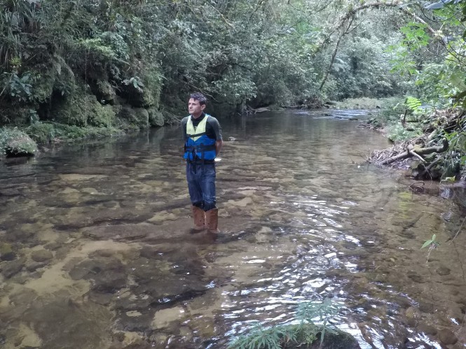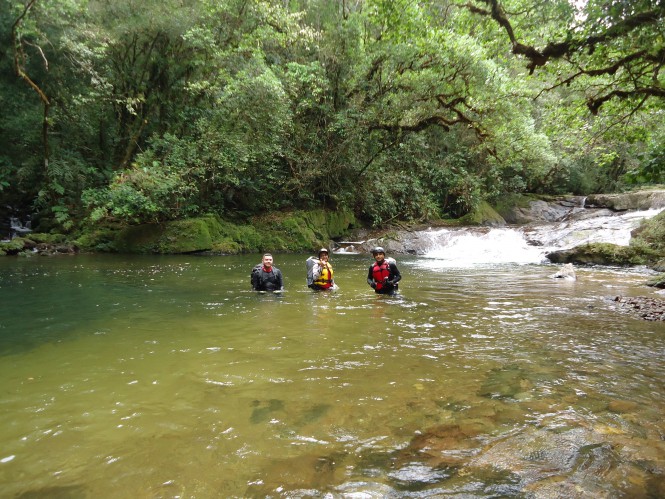 Menos de 2 km nos separava do nosso grande objetivo e agora com os nervos no lugar e os olhos grudados no gps, ganhei a dianteira e fui arrastando mato no peito, procurando com os olhos o melhor caminho e sempre atento aos rumos dado pelo nosso navegador e quando ganhamos uma grande calha de onde um córrego nascia e ia se enfiando nas pirambeiras, foi aí que tivemos certeza que o caminho não teria mais volta. Fomos desescalando o riachinho que aos poucos foi crescendo e se avolumando, tanto que foi necessário passar por grandes desníveis e tomar cuidado para não escorregar e pontualmente às 14 horas nossos olhos se maravilharam com o RIO BRAÇINHO, a lenda , o mito, estava finalmente descoberto, hora da comemoração e do alivio pela primeira conquista da expedição.