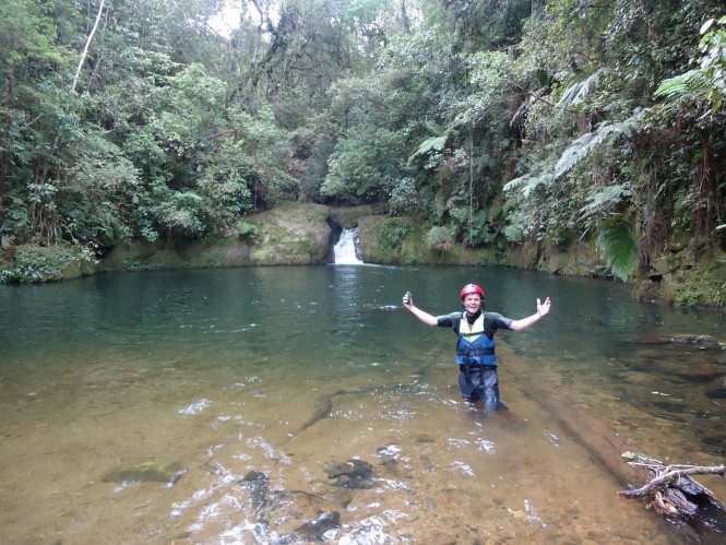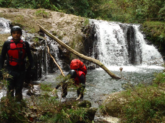 Nesse segundo dia os poços vão se sucedendo de uma tal maneira que vão faltando adjetivos para usar. Logo de cara o rio estreita e uma nova garganta tem que ser cruzada, descida até um ponto em que a gente consiga se jogar de cima dela para dentro de mais um poço profundo em meio as suas corredeiras e sair nadando rapidamente para escapar das águas ainda geladas, por sorte, praticamente todo mundo está servido de coletes e isso ajuda muito na flutuabilidade e numa segurança maior, mas algumas vezes o capacete acaba por ser empurrado pela mochila, colocando alguns em dificuldades, melhor mesmo soltar a mochila ou tirar o próprio acessório da cabeça depois que já se posicionou em segurança dentro do poço. O rio vai alternando entre ser mais raso e mais profundo quando afunila um pouco e quando chegamos a outro grande poço de águas incríveis, cruzamos nos valendo de troncos, onde alguns passaram arrastando a bunda até que, sem poder se equilibrar, acabam indo parar no fundo do rio e nem dá para ficar chateado por ter sido incompetente para passar sem cair porque logo a seguir não há como fugir e é chegar no próximo poço profundo e já se pinchar de novo e para não perder o costume, a sequência é mais do mesmo quando chegamos a uma cachoeirinha. Os mergulhos são divertidíssimos e sair nadando numa água daquelas vai dando uma sensação de prazer gigantesco, é um salto e um orgasmo prolongado.