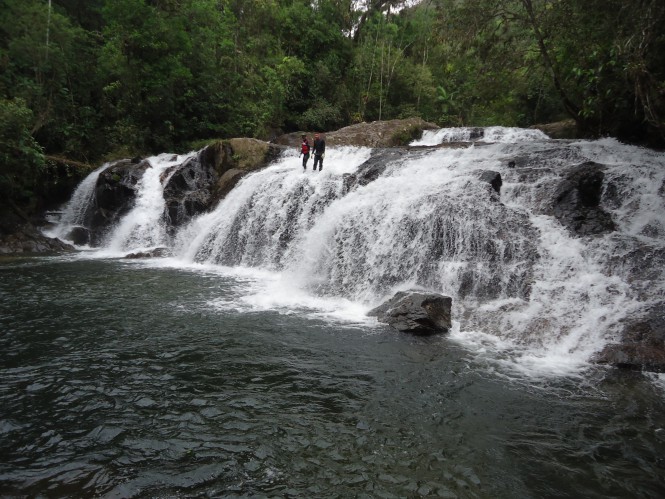 Abandonamos o encontro do rio a sua própria sorte e seguimos nossa labuta, que para variar já nos levava para mais grandes poços profundos e de águas esverdeadas. Mais à frente outra queda d’água é vencida tendo que usarmos nossos freios traseiros para conseguir passar sem se esborrachar ou cairmos dentro das marmitas que se formavam na queda da cachoeira. A sequência é formada por uma infinidade de outros poços e aí a gente vira criança e deixa que o rio nos carregue como bem entender, somos passageiros sem controle, vamos vendo a vida passar nas belezas daquela floresta exuberante e quando o rio cansa de nos dar carona, somos lançados imediatamente dentro de um grande lago e lá ficamos por um bom tempo para reabastecer o estômago e tomarmos folego.