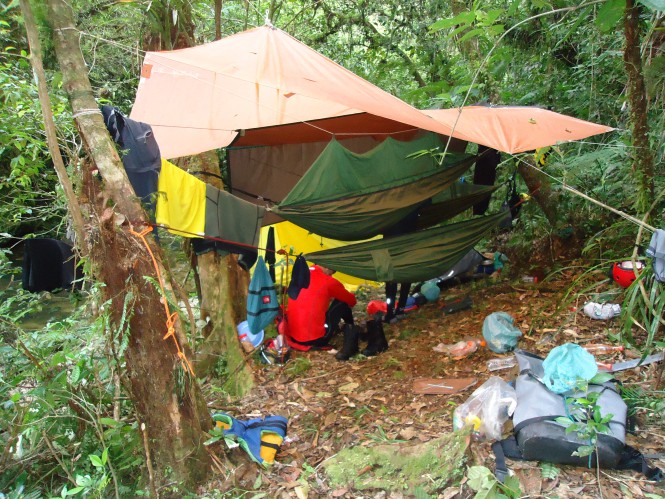 Nessas expedições devido às incertezas, sempre optamos em usar redes com toldos para os acampamentos e discutimos isso durante vários meses, mas o Décio ainda achou melhor carregar uma barraca trambolhuda, então tivemos que ficar à mercê de arrumar um lugar que pudesse comportar também uma barraquinha e por sorte nessa travessia, foi possível sempre conseguir lindas áreas de camping e foi numa dessas áreas, plana e com várias árvores grossas à disposição, que jogamos nossas mochilas ao chão e demos por encerrado àquele dia de atividades intensas , hora de tirar a roupa molhada e ir cuidar da janta e da montagem das nossas camas de mato.