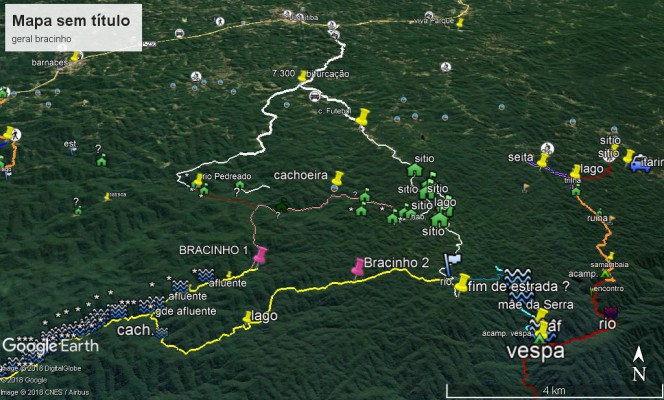 O rio apresenta duas nascentes distintas em forma de “Y”, sendo a nascente da direita (de quem desce o rio) a menor e a esquerda a maior, as duas se convergindo para formar o “Grande Bracinho”. Pois bem, saber por onde corre essas duas nascentes era o “x” da questão, porque era um emaranhado no meio de uma floresta gigante e longe, muito longe de qualquer lugar habitado e com acesso motorizado. Os estudos nos levaram a escolher 2 pontos de acesso, uma em cada ponta dessas nascentes, sendo a nascente mais curta distante uns 20 km de Juquitiba e a mais longa uns 30 km. No final chegamos à conclusão que pelas condições da estrada, a vertente mais curta poderia ser a mais interessante porque nos daria a possibilidade de fazer esse caminho usando um transporte que nos deixaria a pelo menos umas 4 horas de caminhada do rio varando mato, não era nada animador, mas era o que tínhamos , era ao que poderíamos nos apegar se quiséssemos realmente tentar colocar aquele rio no mapa.
