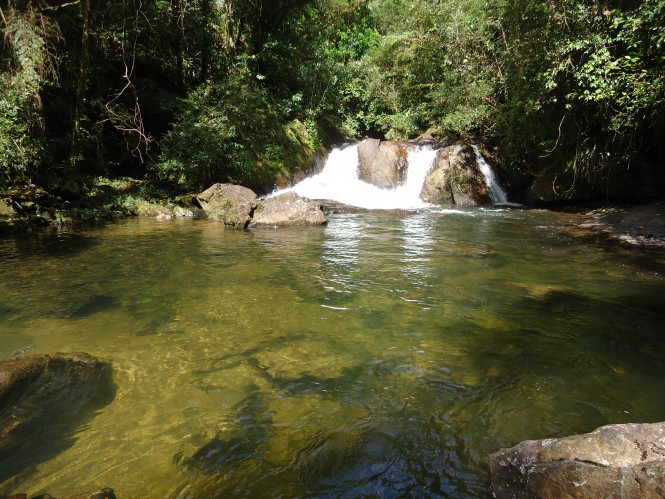 Depois dessa sequência de diversão aquática o rio arrefece um pouco e volta a ser mais raso e se estabiliza e já vai dando indício de que estamos bem perto do seu grande afluente, a outra perna que vai dar corpo e alma ao Bracinho e numa curva do caminho, um grande poço, um poço sensacional nos dá as boas-vindas e marca nosso encontro definitivo e os ponteiros do relógio já marcavam quase onze horas da manhã.