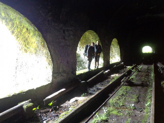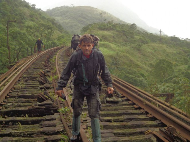 Os dormentes praticamente não existem mais e os trilhos passam ao lado de uma trilha, o que torna o caminho muito legal para caminhar. Mas essa não é uma caminhada turística, é uma caminhada ariscada, onde pontes de quase uma centena de altura terão que ser cruzadas, e são pontes totalmente destruídas e carcomidas pelo tempo, onde um descuido pode levar a um tombo fatal no abismo. Passamos por alguns túneis, que não sei se é verdade, dizem que foi escavado a mão. São obras realmente inacreditáveis, já que foram feitas há quase 150 anos atrás, o que nos faz acreditar que muita mão de obra escrava foi usada por aqui.