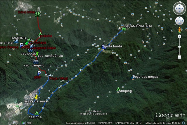 Não é a Funicular e sim a do sistema CREMALHEIRA. Cremalheira é uma peça mecânica que consiste numa barra ou trilho dentado que em conjunto com uma engrenagem a ele ajustada, converte movimento retilíneo em rotacional e vice-versa. Esse é o sistema usado hoje para subir e descer a Serra do Mar, já que a Funicular foi totalmente desativada na década de 80. Mais alguns metros à frente já estávamos estacionados na Estação Raízes da Serra, hoje abandonada e logo mais à frente à estação de manutenção que é usada pela MRS, que é a empresa que opera agora todo sistema. Tiramos umas fotos e seguimos em frente, agora caminhando por uma estrada de terra paralela aos trilhos. Passamos pela portaria sem que ninguém nos incomodasse e mais à frente, junto a uma grande Jaqueira e bem em frente a uma casa que está do outro lado da linha, onde uma mangueira enche um reservatório de água, deixamos de vez a estrada e entramos em uma singela trilha.