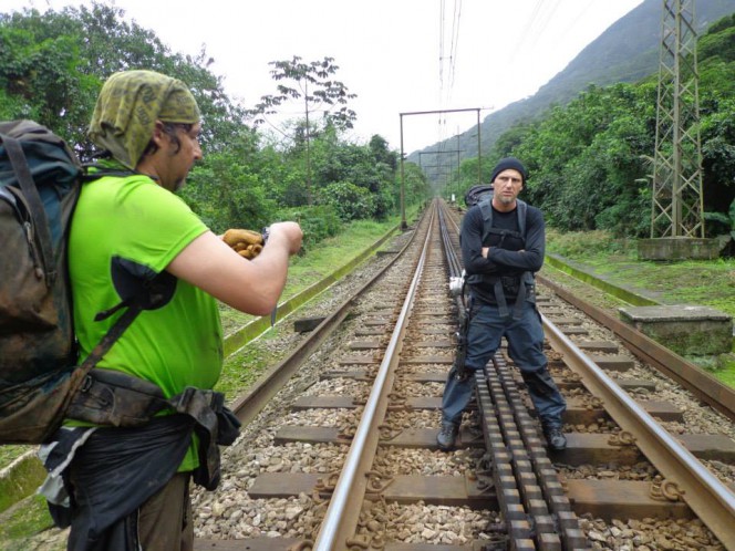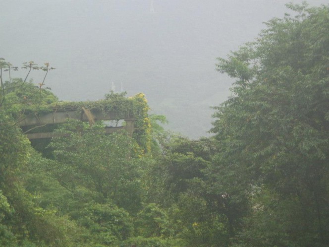 E eis que de repente surge em nosso caminho a primeira ponte a ser cruzada. MAIS QUE DESGRAÇA É ISSO? Era uma ponte que mal se segurava em pé, com os dormentes que já havia se dissolvido pelo tempo. São dois pares de trilho e no início fomos caminhando com um pé em cada trilho, afastados uns 30 centímetros um do outro. Eu fui em pé, prendendo a respiração e andando o mais ereto possível para que a minha mochila não desequilibrasse e me jogasse no vazio. O Lindolfo não se fez de rogado, ajoelhou nos trilhos e foi implorando a deus que o sofrimento acabasse logo (rsrsrsrs). Até a metade da ponte, onde era possível manter os dois pés paralelos aos trilhos, eu fui bem, mas depois, quando os trilhos de transformam em apenas um eu fui obrigado a passar para o lado de fora da linha férrea ,ou seja, andar à beira do abismo. Pra piorar começou a chover bem no meio da travessia, o que deixava os trilhos escorregadios. Concentração, respiração presa, olhos fixos nos trilhos, mochila equilibrada, MAS QUE DIABOS MESMO EU ESTOU FAZENDO AQUI?