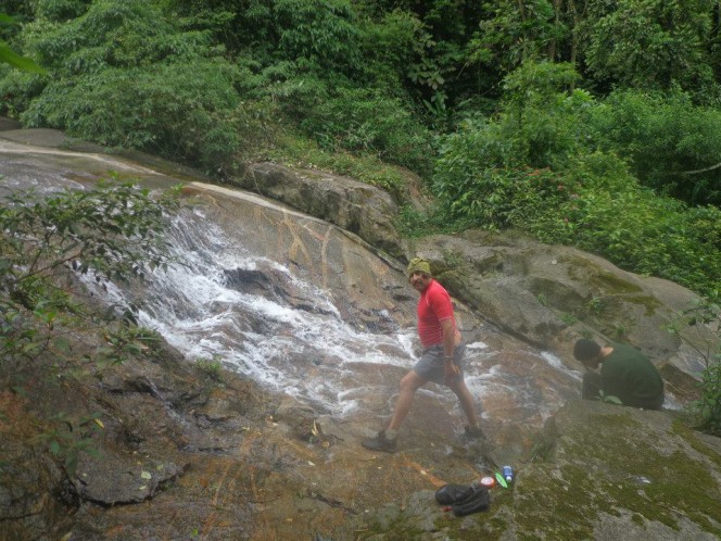 Passava das 18h00min quando entramos na trilha. Estávamos realmente quebrados e cada passo dado era como se nos dirigíssemos para forca. O caminho segue pela mata e alguns riachinhos são cruzados até que a trilha intercepta um rio e começa a segui-lo por dentro, onde parte de uma das pontes da ferrovia vieram parar, depois que ela desabou. O Eduardo seguiu à frente, nos guiando e o Lindolfo seguiu atrás e quando o Eduardo disse que havia perdido o caminho e teríamos que nos guiar pelo pedestal da ponte em ruínas, tendo assim que subir pelo barranco mesmo, o cara “fez beicinho” e se recusou a arredar o pé dali. O Lindolfo estava acabado, parecia não ter mais força para dar mais um passo. Ele havia sucumbido ao esforço físico e mental que o vale da morte havia nos enfiado na cara. Não, ele não iria mais a lugar algum, iria acampar ali mesmo. Bom, eu não estava melhor que ele e a possibilidade de ter que trepar em outro barranco também não me agradava, mas como o Eduardo havia nos dito que acamparíamos em um lugar abrigado, e por achar que o limite do ser humano só acaba quando ele perde a consciência, persuadi o meu primo a continuar caminhando. Miramos para a direita, na direção do pé da ponte destruída e abandonando o rio de vez, fomos seguindo naquela direção e logo subimos o barranco e tocamos o nosso alvo. Ao lado da ponte sobe uma escada de concreto que intercepta a trilha principal.