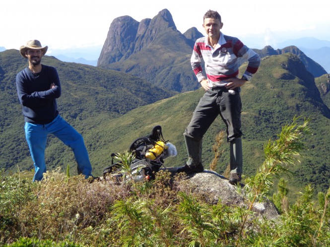 Ao longo do caminho nos deparamos com uma pedra que interceptava a trilha. Uma pedra fina, onde era preciso montar sem as mochilas. O Dema passou pela pedra, depois eu passei a mochila para ele e então ao colocar a mochila no chão, a dita cuja rolou trilha abaixo e despencou em um buraco. O Dema desesperado, achando energia não sei de onde, desembestou atrás dela e sumiu no abismo. Eu fiquei lá, tentando resolver o problema da minha mochila e preocupado com meu amigo que havia desaparecido. Gritei por ele e nada. Dei mais um grito e só ouvi um gemido. Pronto! O Dema se lascou todo, pensei logo. De repente vi o cara emergir do buraco com a mochila na cabeça e apesar da situação tive que rir do ocorrido. Deixando para trás o buraco comedor de Dema, continuamos seguindo pela trilha, tentando localizar o ponto de água descrito no meu mapa. Colhemos a água e logo abaixo começamos a ouvir vozes. Foi quando de supetão demos de cara com o Getúlio e o Liu. Anos depois de manter um contato somente virtual e por muitas vezes ter recebido dicas e conselhos, eu estava honrado de ter podido conhecer um dos ícones do montanhismo paranaense.