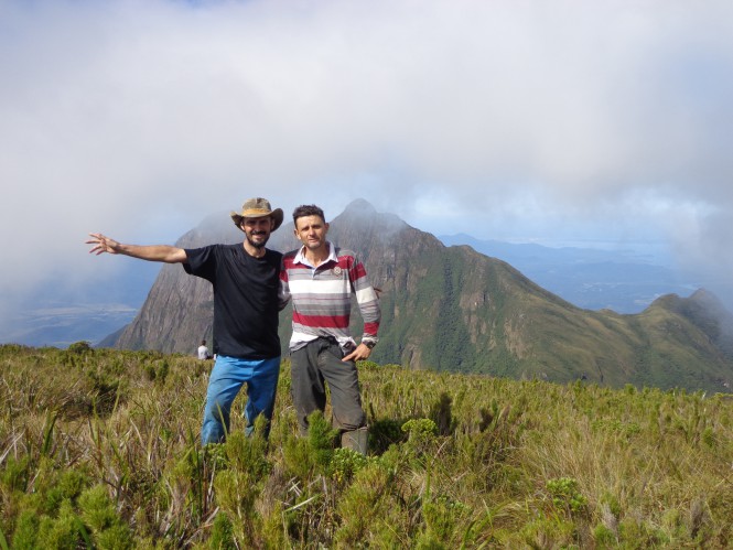Ao chegarmos ao topo ficamos muito decepcionados ao não encontrarmos mais o Getúlio e o Liu. Na minha cabeça os dois estariam acampados por lá e não encontra-los mais, significava um grande problema, mas por hora tínhamos também a nossa frente uma paisagem deslumbrante e o mirante à beira do abismo de centenas de metros é realmente estonteante. O tempo se abriu de novo e aproveitamos para descansar por uns 15 minutos, enquanto fazíamos pose para as clássicas fotos com as pernas balançando no vazio. O Taipabuçu tem na verdade três cumes e é do último cume que sai a trilha para o distante Ferraria. Já passava das 4 horas da tarde quando tivemos a ideia estúpida de continuar até o Ferraria. Parece haver uma hora na travessia que é necessário alguém de sensatez para dizer que chega, que é hora de parar, que é hora de dar um basta, um stop. Mas como só estávamos eu o meu amigo Dema, dois indivíduos sem o menor senso de limite, resolvemos mesmo seguirmos enfrente (rsrsrsr). Continuamos pela trilha até o segundo cume e de lá tomamos a trilha que vai seguindo meio pela esquerda, desce a um pequeno vale e sobe bordejando o terceiro cume pela esquerda. Na verdade a trilha não chega nem ir ao terceiro cume e logo vira de vez à esquerda e começa a descer para o abismo perigoso, onde todo cuidado é pouco. Entra na mata e segue sempre descendo. Nós sabíamos que seria quase impossível chegar ao Ferraria pois logo a noite cairia e encontrar a trilha não seria tarefa fácil, mas mesmo assim fomos seguindo, um pé à frente do outro, esperando o que o caminho nos reservaria.