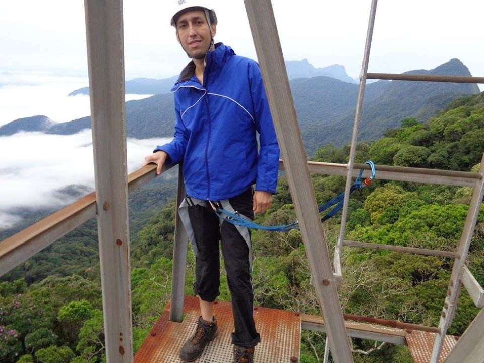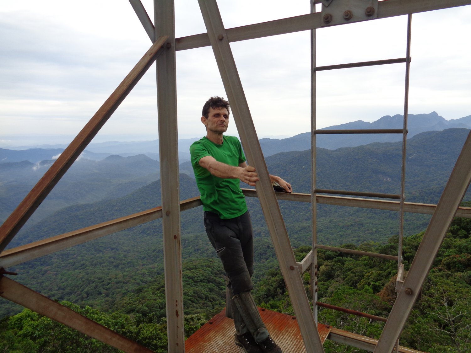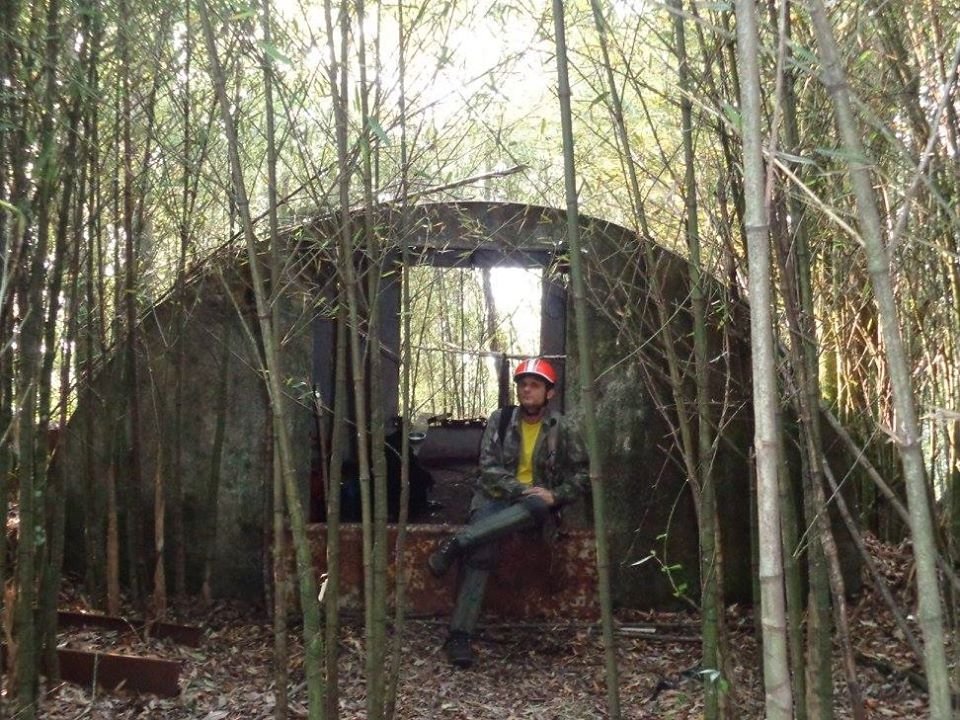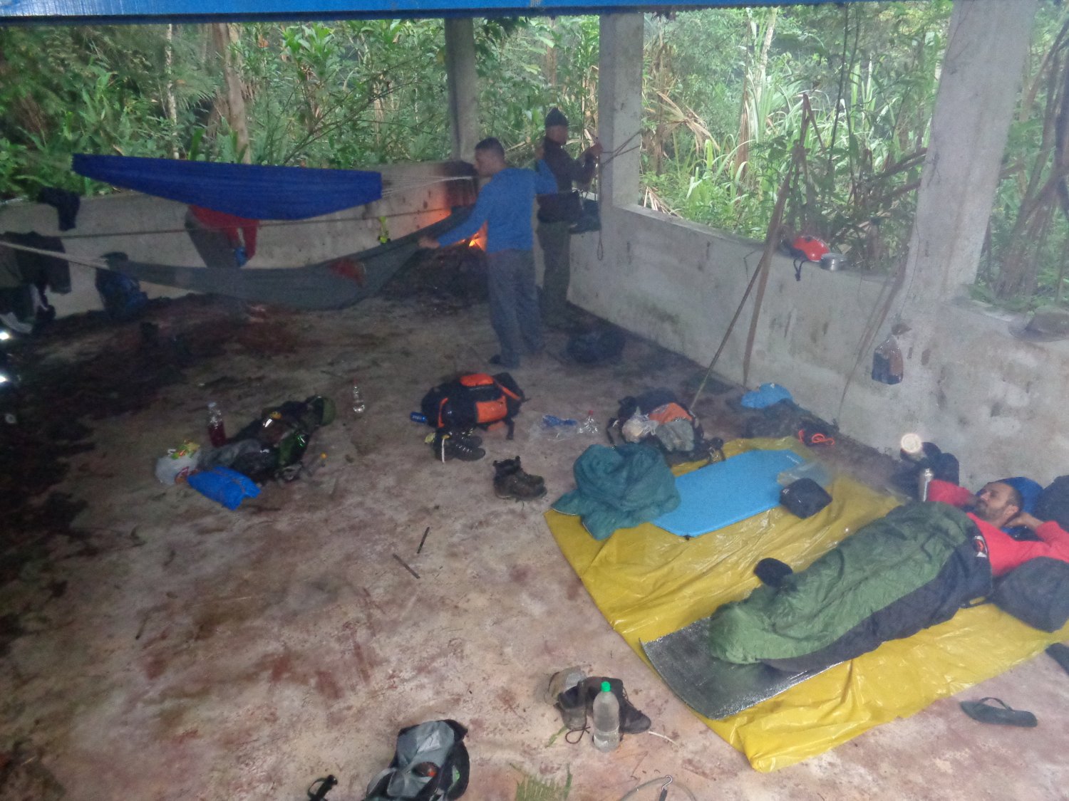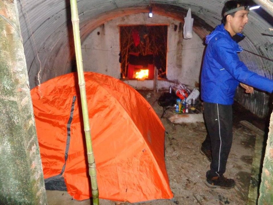 O abrigo é lindo e surpreende que ele não tenha ruído com o tempo. Está um pouco sujo de terra, mas praticamente sem umidade. Em frente do abrigo, logo depois do bambuzal, está a grande antena e por incrível que parece, nem 40 anos de abandono foi capaz de derrubá-la, pelo contrário, ela está totalmente preservada e sem ferrugens. Depois da antena temos uma casa de madeira que só não desabou por completo porque suas madeiras se entrelaçaram, mas cair é questão de tempo. Pegamos umas madeiras para tentar acender uma fogueira dentro do abrigo e enquanto o Alexandre cuidava deste ofício, sai à procura de uma tal caixa de água que diziam haver no local, mas depois de rodar tudo, voltei com as mãos vazias e certos de que a gente estaria lascado naquele pico sem água. Diante do problema, resolvemos tentar colher água acumulada nas folhas das árvores, mais precisamente nos bambus. O Alexandre esticou um grande plástico no chão e começou a balançar o bambuzal e acabou colhendo uns dois copos de água, muito pouco para quem pretendia ficar por quase dois dias explorando o lugar, o jeito era torcer para que a chuva voltasse a cair para a gente poder nos abastecer. Para não contar com a sorte, tirei a roupa molhada e coloquei uma seca e fui de novo atrás da tal caixa de água.