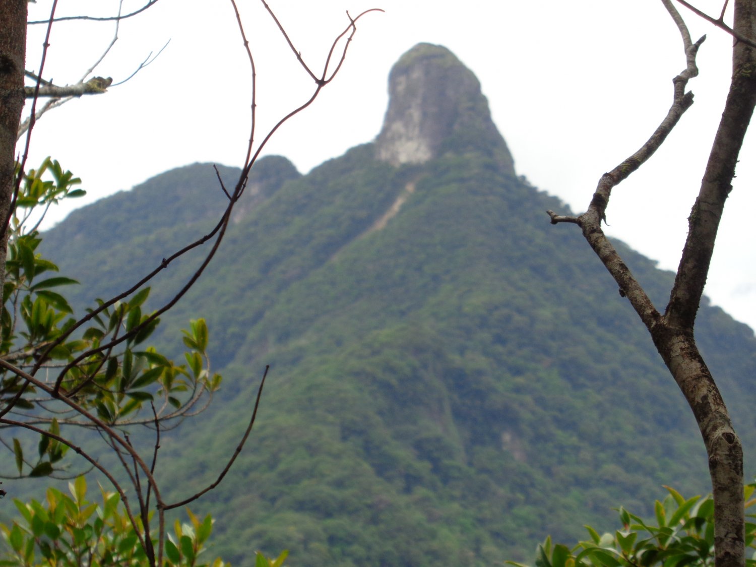 Choveu a noite toda e quando o dia clareou, choveu mais ainda e eu só fiz colocar minha cabeça para fora do saco de dormir e vendo que la fora o mundo acabava em água, voltei a dormir até que às nove da manhã a chuva cessou e então nos levantamos, bem-dispostos e descansados e aí foi hora de traçarmos um plano para o decorrer do dia. Seguir em frente para tentar alcançar a MONTANHA ESQUECIDA não parecia ser mais possível, não haveria mais tempo hábil para isso, portanto, juntamos apenas alguns equipamentos de segurança em uma mochila de ataque e partimos deixando tudo no nosso abrigo de montanha. Passamos ao lado esquerdo da antena, subimos a escada de concreto que leva a casa em ruínas e se enfiando no bambuzal, seguimos uma trilha à esquerda, seguindo uma mureta com elementos vazados, até que ela acaba de vez alguns metros à frente. Pulamos a mureta e interceptamos outra trilha e a seguimos até chegarmos a grande pedra que está a não mais de uns 60 metros da antena. Subimos escalando uma pedra menor que está à direita da grande pedra e a partir dela tentamos encontrar uma trilha que nos levasse até o cume do Pico Boa Vista, mas não obtivemos sucesso, então voltamos e pegamos à esquerda da grande pedra e ali localizamos um velho fio que nos ajudou a vencer o desnível de uns três ou quatro metros. Aí fomos seguindo escalaminhando um barranco íngreme e nos segurando em tudo que é raiz até que chegamos a um lugar onde o terreno estabiliza e ao localizar o que parecia ser uma trilha fechada, seguimos por ela mata adentro até chegarmos ao que parecia ser o cume do Pico Boa Vista (1.140 m).