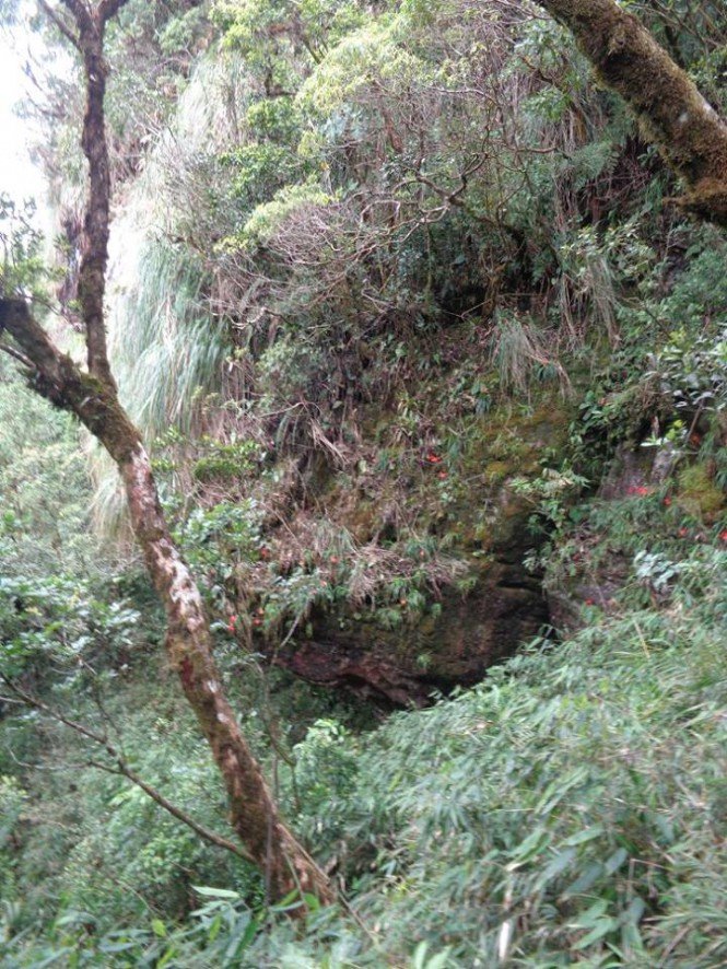 Descemos por aquele selado o quanto deu e ao chegarmos a borda de mais uma garganta profunda, não tivemos alternativa senão virarmos para a esquerda e procurarmos outra rampa de conexão e mais uma vez, se valendo da experiência de anos no mato, descobrimos analisando o topo da floresta que se apresentava mais abaixo de nós, mais um possível caminho. Descemos à beira de uma garganta nos segurando nos cipós entrelaçados que nos serviu de corda e fomos caindo pela direita até encostarmos-nos a uma parede rochosa aonde de uma pedra escorria muita água sobre uns musgos, onde serviria para nos matar a sede se estivéssemos em apuros, mas não sei dizer se em tempo muito seco, existiria água ali e a esse lugar demos o nome de Pedra que Chora, para marcar bem o local numa próxima expedição. Depois desta pedra o terreno vai descendo e novamente temos o vazio dos dois lados, o que nos dá a certeza de estarmos mais uma vez caminhando por outra rampa. Não há uma trilha propriamente dita, vamos seguindo o rumo do terreno, que logo começa a curvar-se para a esquerda e vai se encaminhando para a direção que desejamos. A trilha vai se estabilizando e ao nosso lado direito parece que vai sair no aberto, mas nem chegamos a investigar porque agora aos nossos pés está uma trilha que já se consolidou e apenas está obstruída com muito mato por falta de uso há muitos anos, mas fica claro que aquilo é sim uma trilha. Começamos a perder altura aos poucos, passamos por uma imensa e inconfundível árvore vermelha, até que chegamos ao fundo de um vale com espaço suficiente para acampar e a esse lugar dei o nome de Vale Verde.