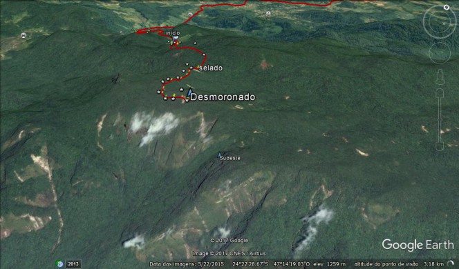Outro fato que é necessário relatar é que esses dois picos em primeiro plano não pareciam oferecer uma coisa muito importante para atrair qualquer montanhista para o seu cume e talvez esse fosse um dos grandes motivos de ter se mantido virgem até aquele momento. Quem em sã consciência se meteria a enfrentar um vara-mato por dias para chegar ao seu cume e não enxergar coisa alguma? Pois é, esse também era o grande problema para atrair mais algum trouxa (opsss, montanhista) que pudesse acreditar naquele projeto. Ai que veio o pulo do gato! Nos estudos encima do mapa de satélite localizei um grande desmoronamento que rasgava a montanha por uns 200 metros bem ao lado do cume, sendo que no mapa, parte deste deslizamento gigante, se precipitava no vazio da parede por quase 100 metros e isso, na minha cabeça, era visual certo de todo a parte sul da serra, justamente a que nos daria vistas para todos os grandes picos e do litoral de toda a Juréia.