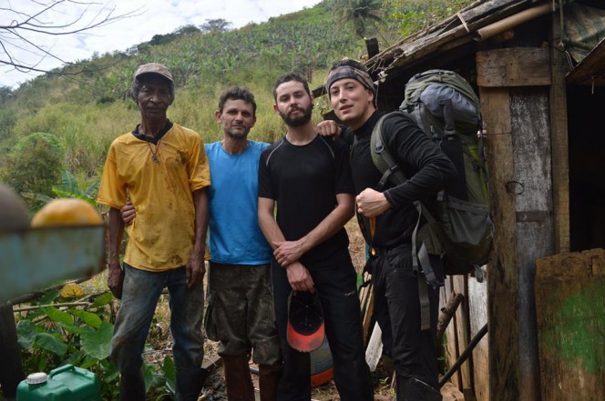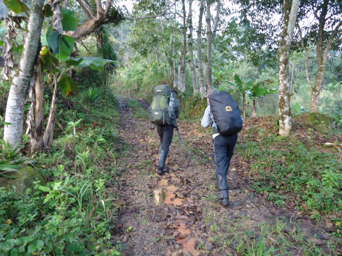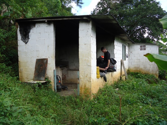 Guardamos o veículo junto ao galpão, jogamos as mochilas nas costas e partimos. E já partimos em grande estilo, sempre subindo e alguns minutos depois passamos por uma bica de água e como já estávamos com o cantil abastecidos, passamos batido. A estrada/trilha vai serpenteando montanha acima sempre cruzando no meio de enormes bananais e quanto mais subíamos, mais as vistas se alargavam. Depois de uns 2 km chegamos à uma bifurcação, onde um rancho de lona azul é encontrado. Nesse ponto já estamos a 500 metros de altitude e nessa bifurcação pegamos o caminho da direita que vai se enfiando no meio da floresta, onde a estrada embica para cima de vez e vamos percorre-la por mais 1,5 km até que finalmente tropeçamos num casebre abandonado e ali paramos para um breve descanso antes de darmos início a expedição selvagem. Estamos na cota dos 700 metros de altitude e o Natan e o Potenza, vendo que haviam exagerado com o peso nas mochilas, resolveram refazer suas estratégias, tocar o foda-se e deixar parte da comida e alguns agasalhos no casebre e eu, como não havia nada para tirar, tive que me conformar e amargar um peso de mula andina nas minhas costas.