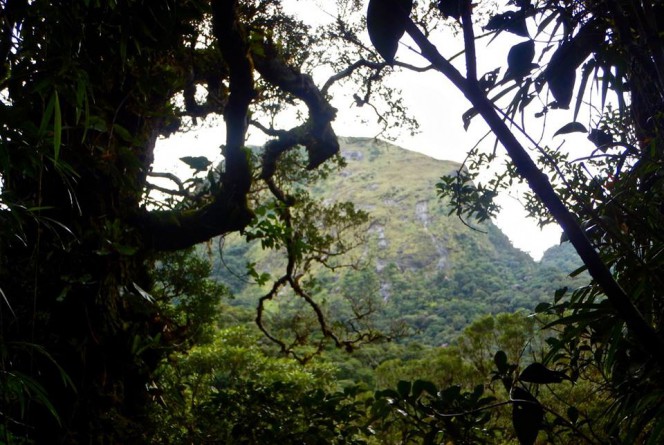 Até então a gente havia tomado a direção sudeste e a partir do selado, nosso caminho fez uma curva bruscamente para o sul, ande teríamos que galgar quase todo o cume arredondado da próxima montanhas para aí sim, nos virarmos de vez para o leste, até tentarmos atingir o cume da serra. A pernada então continua para o alto, avançando lentamente, um pé à frente do outro, eu sempre na dianteira, revezando com o Potenza a dura tarefa de abrir mato no peto e o Natan fazia a parte mais importante, que era a de fazer com que a gente nos mantivéssemos o mais próximo possível no caminho previamente traçado no mapa. É uma navegação praticamente às cegas, sempre tendo que confiar no GPS do celular, mas como a vegetação não estava nem aí para tecnologia, insistia em nos mandar para onde ela queria e logo nos víamos longe da linha traçada, tendo que recalcular nosso rumo e procurar um terreno e uma vegetação mais favorável para podermos passar.