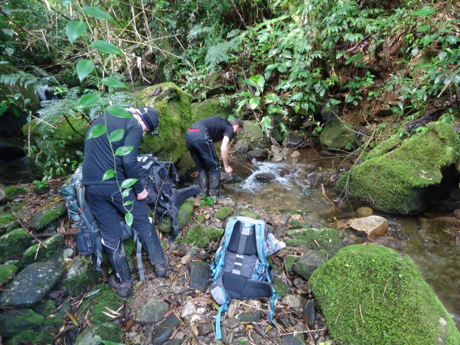 O dia foi passando e a gente enroscado naquele terreno e nossa água foi acabando e sem perspectiva de molhar a garganta com abundância. Foi aí que começou a surgir nas nossas cabeças as dúvidas sobre que rumo aquela expedição poderia tomar se não encontrássemos água no tal selado que havíamos vislumbrados a possibilidade de encontrar o tal liquido. Se não houvesse água ali, estávamos perdidos. A cada pequeno vale que descíamos e víamos que estava seco, fazia com que nossa decepção aumentasse. Ficamos envolvidos naquele vara-mato sobre a mesma curva de nível por quase duas horas e quando o terreno começou a nos jogar para baixo, sem nem percebermos que havíamos nos afastados da rota do GPS, foi aí que nos deparamos com um primeiro filete de água e mais abaixo ela jorrou aos montes e as caras carrancudas até então, se abriram num sorriso de alegria e felicidade. Mas aquela pequena nascente não era somente mais uma das milhares de nascentes que se encaminham para os vales para formar os rios da serra, era simplesmente a principal nascente que forma o GRANDE RIO DESPRAIADO. Era ali, exatamente naquele lugar que ele nascia e nós erámos provavelmente as primeiras pessoas que se tem notícias a botar os olhos na sua nascente, mas isso pouco importava naquele momento. Diante naquele achado, estávamos de volta ao plano principal, que era o de botar os pés no cume da Serra dos Itatins-Juréia.