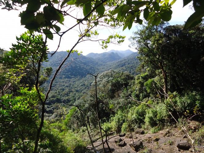 Desmontamos tudo, tomamos café, colhemos água e partimos. Logo de cara temos uma parede íngreme para subir, mas no início até que a vegetação ajudou, mas não demora muito já estávamos lá nós de novo a comer bambu e a brigar com cipós, taquaras e bromélias espinhudas. Logo na primeira hora de caminhada, o caminho nos leva direto para um grande deslizamento, aonde uma grande parede de rocha nua, nos presenteia com a primeira visão de todo o vale e as montanhas que se entendem em direção de Itariri.