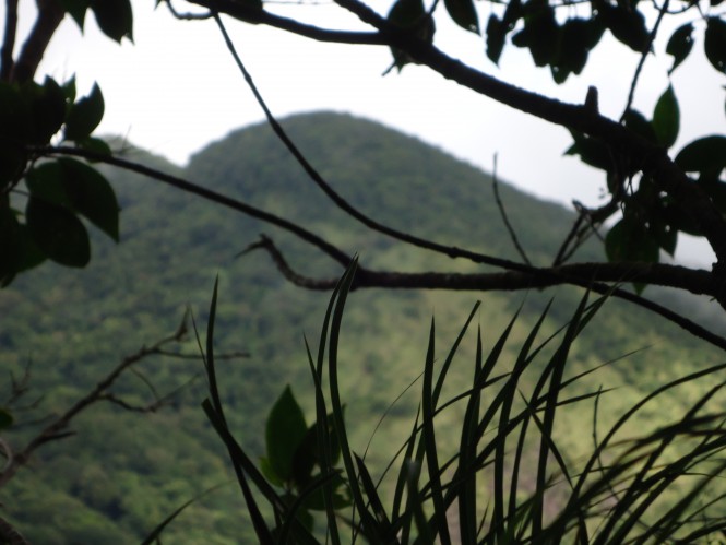 Saímos pelo lado direito da rampa da serpente, subindo o barranco e nos enfiando por baixo de mais bambus. A nossa rota indicada pela linha do navegador, nos dizia que deveríamos seguir em frente, mas para escapar de mais uma vegetação fechada, resolvemos subir um pouco para a esquerda, haja vista que logo interceptaríamos o caminho que teria que fazer a sua grande curva para a esquerda. Esse trajeto nos deu a oportunidade de, através de uma janela na mata, podermos botar nossos olhos na montanha que almejávamos, mas o pico nos pareceu tão alto que chegamos a duvidar que seria mesmo o pico que buscávamos. A gente já tinha quase certeza que o pico a Sudeste do Desmoronado era muito mais baixo, mas visto de um ângulo diferente, ele era meio bicudo, então isso nos fez crer que poderíamos estar olhando para ele, mas nos enganamos bonito.
