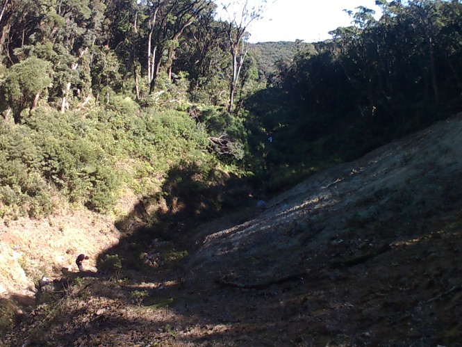 Percebendo o erro no mapa, agora sabíamos que nosso caminho deveria seguir por dentro do grande vale, subindo o riacho até a sua nascente por uns 200 metros. Até tentamos fazer isso, mas como em um primeiro momento o terreno se mostrou quase impassável, resolvemos bordejar pela direita, varando mato e quando vimos que o riacho começou a correr livre dos troncos e capim alto, pulamos para o seu leito e fomos subindo até que ele acabou na sua nascente principal, encravada entre dois desmoronamentos monstros, um a esquerda e outra à direita, justamente a última rampa que nos levaria para a conquista final.