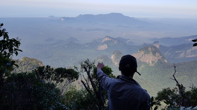 Deixado o caminho espinhoso para trás, o terreno melhorou, mas a inclinação continuava a mesma e logo quando chegamos a que nos pareceu meio com um bosque, paramos para um descanso providencial e um gole d’água, foi aí que um barulho fez com que a gente tremesse as pernas: Estávamos bem próximos de um enxame de vespas e era nítido e claro o som dos seus zumbidos. O Natan e o Potenza ficaram ainda mais assustados com a presença dos insetos, mas quando um barulho de porco ressoou na floresta, nós três já nos viramos e sem pensar muito, nossos olhos já tentaram localizar uma arvore para subir, porque ali ninguém queria virar presa de queixada ou mesmo de algum javali, mas felizmente, do mesmo jeito que veio, o som sumiu sem deixar rastro.