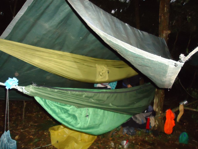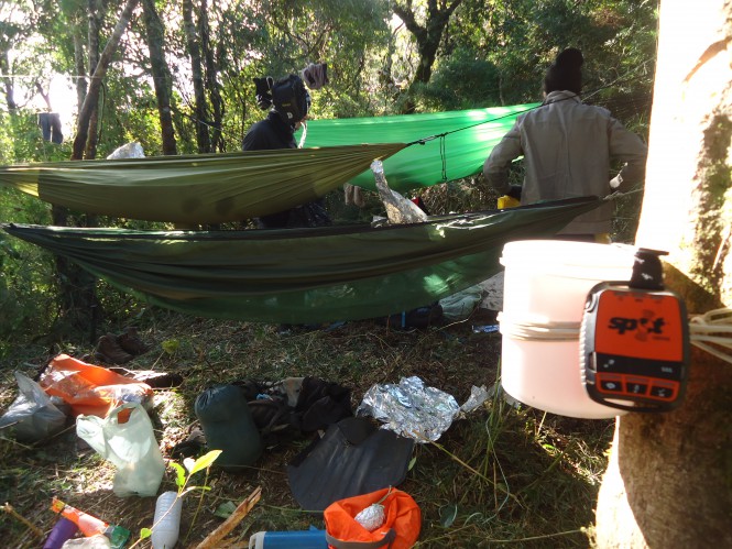 O dia já ia findando, mas a gente ainda não havia localizado nenhuma área propícia para acamparmos. Pensamos em descer e tentar algo mais abaixo, mas depois decidimos que seria muito mais cômodo ficarmos no cume, onde pretendíamos, no dia seguinte, fazer a medição com os 3 equipamentos de gps e também abrir uma janela maior que nos desse uma tomada de 180 graus de toda a Juréia. Como estávamos com redes, a única coisa que precisávamos fazer era amassarmos os bambuzinhos e limpar os cipós para liberarmos uma área entre três árvores. Fizemos um ótimo trabalho e em mais cinco minutos pendurei a minha rede, enquanto os meninos, mais uma vez, ficaram umas duas horas brincando de montar tendinha (rsrsrrs).