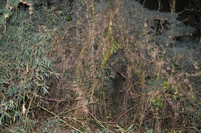 O enxame de vespas abreviou nosso descanso e achamos melhor sair dali o mais rápido possível e então voltamos para o ofício de varar mato no peito. Quando tracei aquele roteiro, procurei evitar de ir até o cume daquela primeira montanha, mesmo porque, teríamos que descê-la novamente até o grande selado que nos serviria de “ponte” para passar entre duas gargantas afim de alcançarmos outra montanha, mas infelizmente ter desviado a rota desse primeiro cume acabou por se tornar um grande erro, porque acabamos ficando nos equilibrando numa curva de nível a uns 1.150 metros bem na encosta da serra. Não que o declive fosse assim tão perigoso de se caminhas, bem longe disso, mas a vegetação que se apresentou à frente nesse trecho nos fez mais uma vez comer bambu e todo tipo de vegetação espinhuda novamente. A gente não avançava nada e toda hora a vegetação acabava nos afastando do trajeto planejado, nos fazendo ziguezaguear hora para cima, hora para baixo.