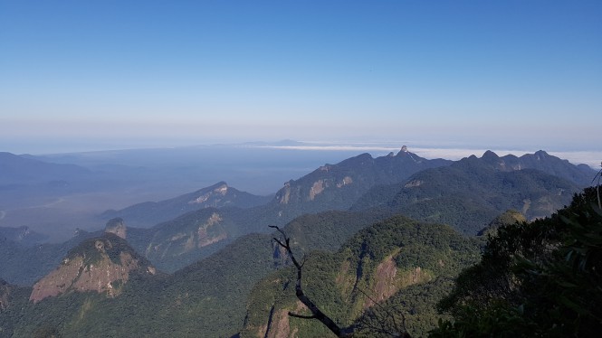 Entre cotoveladas e empurra e empurra, por pouco um de nós não foi conhecer as profundezas do abismo pela primeira vez na história. Cada qual lutava com as armas que tinha para poder se maravilhar com aquele espetáculo que se descortinou diante dos nossos olhos. Ainda era uma pequena janela miserável entre a paisagem, mas já foi o suficiente para cada um de nós se encantar diante de tamanha beleza. Aquilo nem parecia real e mesmo com o tempo apresentando uma bruma que cobria parte do horizonte, assim mesmo, a gente pode se dar conta que estávamos diante de um dos maiores espetáculos de montanhas do Brasil. Ali estava ela, toda a Reserva Ecológica da Jureia diante dos nos pés, com toda as suas matas, seus bichos, seus rios e suas praias selvagens, um dos maiores patrimônios da Humanidade. A sudoeste, ainda meio escondido entra as nuvens o gigante Dedo de Deus Paulista e toda a sua cadeia de montanha com espigões de pedras espetados acima da floresta. Do nosso lado esquerdo, quase já fora da nossa visão, o PICO SUDESTE 1.389 m, justamente aquele que poderia ser o cume da serra se por acaso viesse a ter alguma torre rochosa em seu cume, do qual a carta não podia nos mostrar, era visivelmente bem mais baixo, com seu topo coberto de floresta, quase sem nenhuma elevação proeminente e essa visão completa desse outro pico mudava todo o rumo daquela expedição.