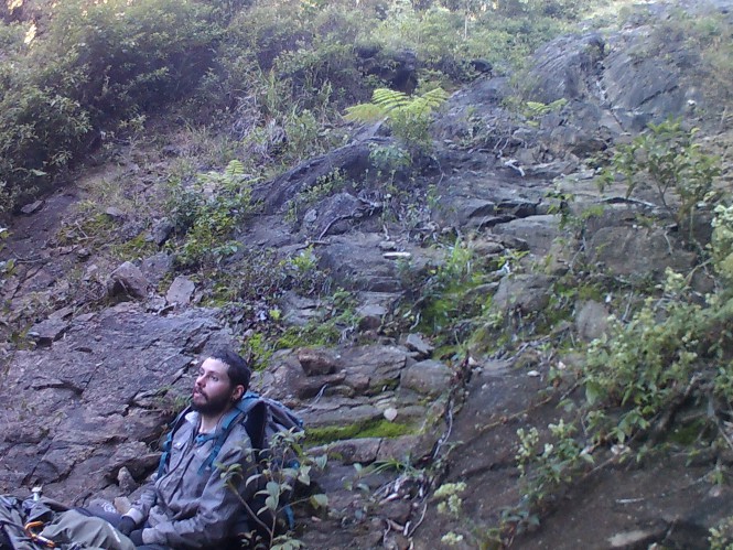 O Natan corrigiu a rota, mas aí já havíamos perdido um tempo precioso e logo percebemos que havíamos saído bem do outro lado do deslizamento de rocha, então fomos obrigados a usar a descida da rocha como caminho, onde por uma bobeira, o Natan perdeu o equilíbrio e foi conhecer a dureza da rocha com sua fuça. Por sorte foi só um susto! Paramos imediatamente para um descanso, mas eu, na minha ingenuidade, ainda sonhava em conseguir pelo menos voltar até a noite para o rancho abandonado e fazer dele nosso lar por um dia, mas os meninos não estavam de acordo com essa correria toda não, já vieram com aquela conversinha de que seria melhor acampar novamente no selado e então fui facilmente persuadido por eles e a decisão foi essa. Já que estávamos bem perto do tal selado, ao invés de voltar a varar mato, decidimos desescalar aquela parede rochosa até atingirmos o fundo do vale e através dele subir até a área de acampamento. Feito isso, em meia hora estávamos de volta onde tínhamos passado a primeira noite, foi como retornar para casa novamente.