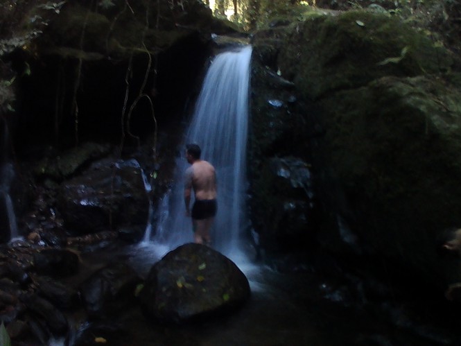Na nossa carta topográfica, víamos claramente que o topo se estendia por uns 300 metros antes que a montanha começasse a despencar de vez em direção ao vale. A nossa progressão foi rápida e perdíamos altitude numa velocidade incrível, mas a gente sabia que teríamos que enfrentar novamente o inferno de vegetação espinhenta novamente, então decidimos fazer um desvio na nossa rota e começar a tocar rumo ao vale do rio que corria à nossa direita e não demorou muito, lá estávamos nós de volta ao leito das nascentes do Rio do Peixe, onde os mais corajosos, não eu, se pincharam para debaixo de uma cachoeirinha de águas congelantes.