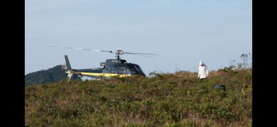Cara, fiquei encafifado mesmo com a história do helicóptero e fui atrás pra ver se descobria algo. Pela sua foto descobri que é um modelo Helibras AS 350 B3 e com mais algum esforço identifiquei a matrícula PR-HDP, que consta na Anac como habilitado para serviço de táxi aéreo. Ou seja, não era nem polícia militar nem federal, mas apenas um passeio que alguma agência o vende para levar turistas até a Pedra do Espelho. Como essa aeronave comporta um número máximo de 5 passageiros, não daria pra oferecerem uma caroninha pro seu grupo.