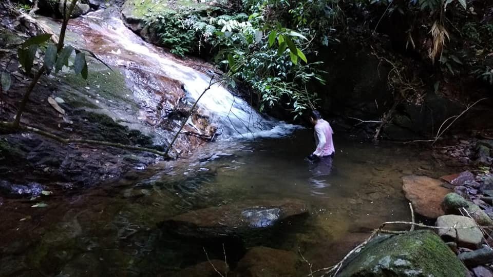 A estratégia deu resultado e não demora muito cruzamos por uma nascente de onde brota um filete de água, que vai se encaminhando por cima de uma pedra lisa dentro da floresta de árvores gigantes. Uma descida rápida em meio à vegetação mais fechada, nos leva a um degrau e ali um grito dado por um membro da equipe faz com que paremos imediatamente: “ Uma ponte gente, corre aqui, tem uma ponte atravessando para o outro lado”. Eu estava atrás e logo levei um susto. Aquilo era inacreditável, estávamos numa encosta de montanha onde era possível que jamais teria recebido pés humanos e como poderia uma ponte naquela altitude, que aparentemente não ligaria nada a lugar nenhum. Corremos para ver a tal ponte e lá só encontramos um tronco velho, caído encima de uma laje de pedra, nada mais que isso, pura obra da natureza. Tomaz Lamosa, o menino da mochilinha dourada, já começava a ter alucinações naquela descida e a gente achando que Lamosa era sobrenome muito pomposo para compor aquela expedição de gente rude e sem grife, resolvemos batizar nosso novo amigo como Tomaz Pontes e assim será chamado nas expedições em que esse valoroso expedicionário participar em nossa companhia.
