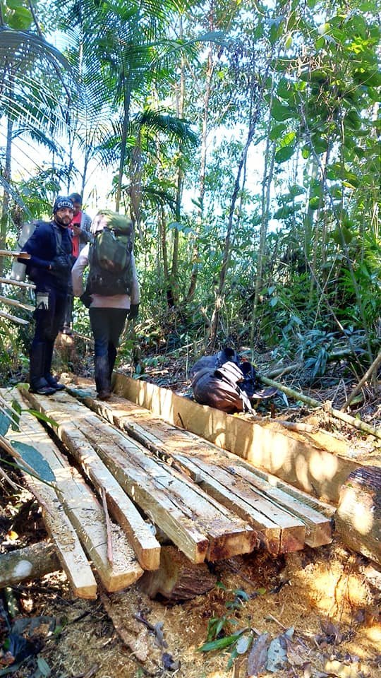 Saímos do rio e fomos margeando, sempre andando a não mais que uns 50 metros da margem, quando se supetão alguém gritou que haviam encontrado um rabo de trilha, um arremedo de caminho, mas estava claro que não era trilha de bicho e quando um corte de facão na diagonal de um galho foi encontrado, tivemos certeza de que poderíamos contar com uma saída mais rápida daquela expedição. Mas nem precisou ir muito longe, 15 minutos de caminhada nos levou ao que nos pareceu ser uma ponte no meio da floresta, agora algo feito pelas mãos humanas, mas logo percebemos que era apenas um tablado grande, onde era usado como apoio para cortar madeira. Logo imaginei que poderia ser um daqueles lugares usados para se construir canoas parcialmente, quando se derruba uma árvore gigante e lapida-se até ficar no formato da embarcação, aliviando o peso da mesma até que se aguente puxa-la para fora do mato.