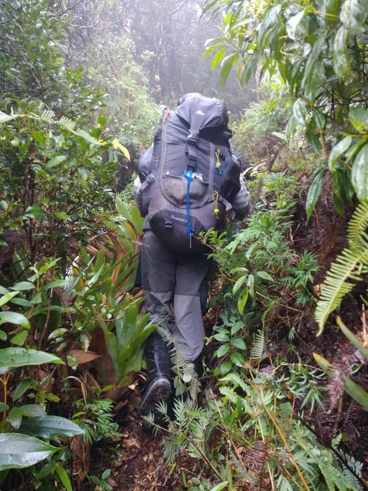 A caminhada vai seguindo lentamente, muito lentamente, o tempo fechado faz chover sobre nossa carcaça e só nos faz lamentar a possibilidade de chegar no cume e não conseguir ver nada. Mas montanhista experiente já sabe que esse excesso de neblina molhada, é sinal de que vai fazer um grande dia de sol, mas como se aproxima das 11 da manhã, a gente já começa a desconfiar que vamos chegar ao topo com mal tempo. Hora ou outra, um tímido raio de sol aparece para alegrar nossas almas, mas some com uma rapidez impressionante e nos faz voltarmos a praguejar contra a má sorte. Pouco mais de uma hora depois, atingimos um ombro da montanha e vamos galga-la por mais de uma hora até que um pequeno selado se apresenta a nossa frente onde se poderia acampar, mas ainda é cedo para pensar nisso e apertamos o passo para a subida final em busca da gloria, mas a única coisa que vemos é mato atrás de mato, um cume fechado, sem visão para lugar nenhum, uma decepção coletiva e silenciosa.