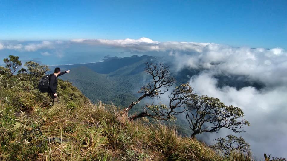 Nossa jornada passa por cima do cume, sem nem perceber , já que não existe algo proeminente que nos diga que ali é realmente o ponto mais alto e segue enfrente até que o mundo desaba sob os nossos pés, fim da linha, fim da montanha e por causa da intensa neblina, não conseguimos enxergar um palmo à frente do nariz. Não há grandes árvores no cume , só pequenos arbustos de pouco mais de metro e meio e foi entre esses arbustos que buscamos alguma visão do litoral de Ubatuba ou da parte voltada para Paratí, mas sem nenhum sucesso, até que um pequeno trilho é encontrado e demos a missão de investigar para o Vagner , que em menos de um minuto gritava feito um gata copulando no telhado.