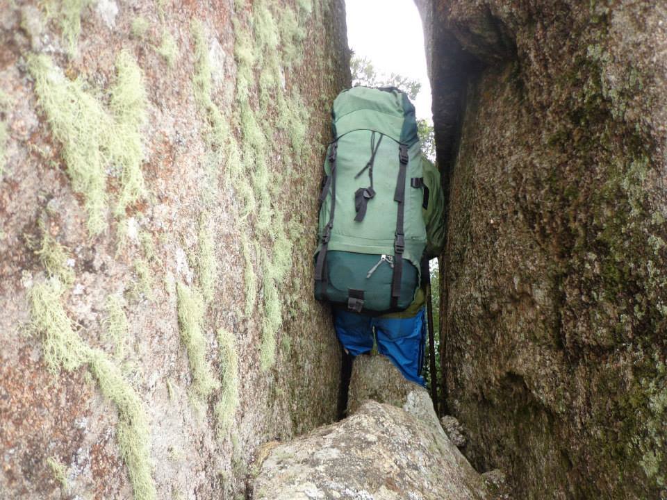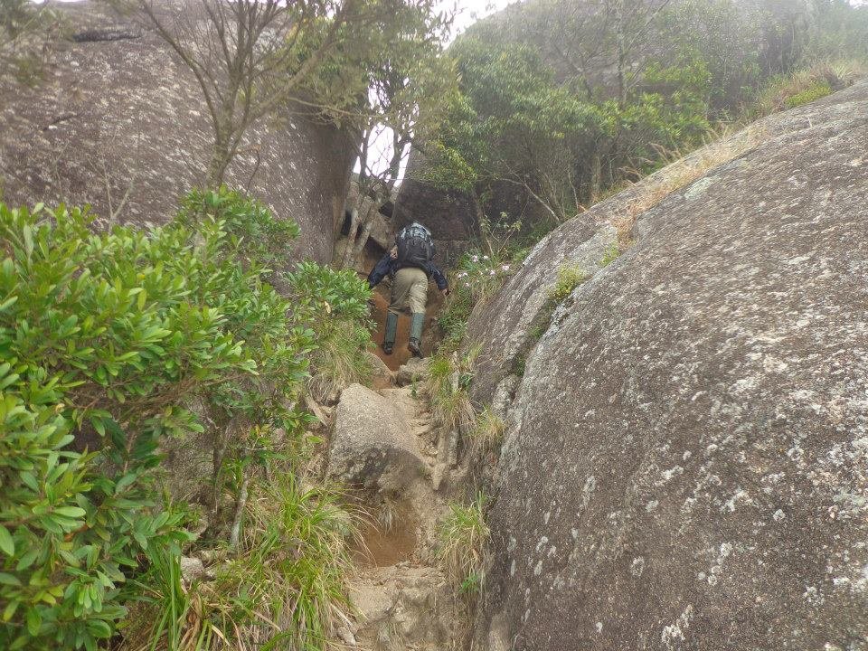 Sempre me perguntei de onde sairia a tal trilha do topo e que seguiria para oeste e daria continuidade na cadeia de montanhas e foi só numa terceira vez que fui ao cume que realmente eu acabei a encontrando. Ela realmente existe e sai depois do cume a direita, quase uma canaleta e que agora para que ninguém deixe de encontra-la, deixei uns totens de pedra bem visível. E foi por ela que abandonamos o cume descendo por um minuto, com muito cuidado, e depois virando à esquerda e caminhando rente a rocha até darmos de cara com uma grande fenda, onde passamos nos espremendo, mas sem termos que tirar as mochilas. Depois viramos à direita e alguns metros à frente é preciso rasgar uns três metros de arbusto no peito para sair na grande rocha exposta, uns 20 metros abaixo do cume.
