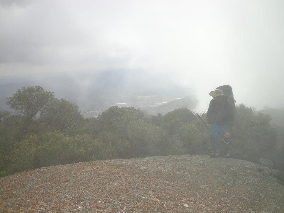 O dia amanhece “nevoeirento” e só lá pelas nove horas, eu e o Dema nos animamos a levantar. Desmontamos as barracas, pegamos três litros de água por pessoa e jogamos as mochilas às costas e partimos. Dois minutos depois, passamos pela Pedra das Flores de onde não podia se ver nada, ainda bem que havíamos garantido algumas fotos quando estávamos acampados com as meninas . Por causa do nevoeiro demos uma bobeada e demoramos para achar a trilha para o Lopo, mas não há segredo, ela esta mesmo seguindo na reta do pico, depois das lajes de pedras, entrando na matinha. Segue por dentro da mata, passa por uma pequena laje exposta, passa por uma saída de trilha à direita. Aliás, essa trilha a direita, onde deixei uma fita para marca-la, é uma alternativa que desce até à Fernão Dias, ou 4 km antes. Ouvi dizer que está fechada por falta de uso, já que o proprietário das terras interditou a passagem de quem quer subir por ela, mas quem for descer talvez não tenha problemas , pois sair é sempre mais fácil que entrar. Mas é uma alternativa curta e sem quaisquer atrativo que valha a pena, relatei aqui apenas para constar. Passamos reto por essa saída e tomamos a trilha enfrente rumo ao estirão final até o Lopo. Começamos a subir, depois descemos um pouquinho e subimos de vez até passarmos por um abrigo junto a uma grande pedra. Viramos a direita até chegarmos a uma escalaminhada, onde uma fenda exige que se eleve o corpo para poder atingir mais um platô acima e depois escalaminhar mais um pouco e se ver nas alturas expostas da pedra.
