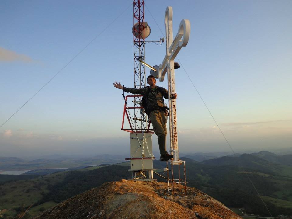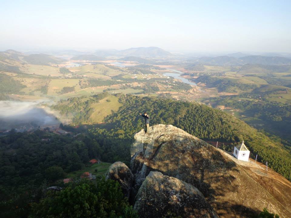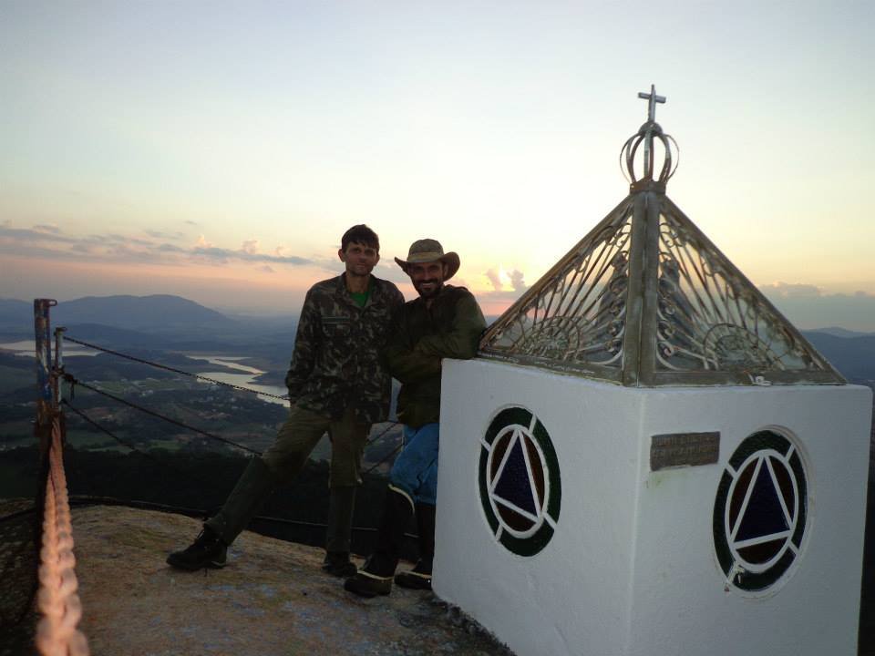 Ainda era dia e o sol se pondo no horizonte dava um charme todo especial ao cume. Não fazia frio, a temperatura era agradabilíssima e depois de algumas fotos junto ao cruzeiro, descemos e fomos explorar o outro cume, já que o topo na verdade é composto por duas grandes rochas. Descemos a escadinha, contornamos a pedra pela nossa direita e chegamos ao cume onde se encontra uma mini capelinha com uma santa, Nossa Senhora das Alturas, mas como o Dema disse :”- Meu, isso aí é santo que outros inventam !” Pesquisando na net não encontrei nada sobre essa santa, parece que meu amigo matou de primeira, rsrsrsrsr. O certo é que a visão de cima da Guaraiúva é realmente arrebatadora e dela é possível ver o estrago que a seca deste ano tem feito com a Represa do Jaguarí. O Dema não cansava de elogiar as belezas que a vista lá de cima do cume nos proporcionava, mas antes que o sol acabasse de morrer de vez, peguei minha mochila e fui para meio das duas pedras, onde praticamente não ventava e tratei logo de ferver uma água para uma sopinha básica, antes mesmo que eu começasse a fazer o jantar. Armamos nossa barraca em um lugar bem abrigado e fomos tratar de fazer o rango, com direito a carne seca com batatas e um macarrãozinho bem temperado. Comemos e nos metemos na barraca e de lá não saímos mais até que o sol de um novo dia viesse nos acordar.