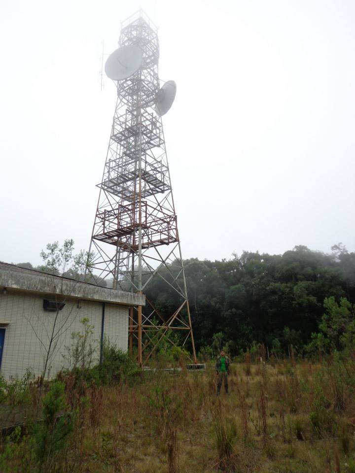 Logo nos apressamos, não queríamos ser pegos pela noite no meio da floresta. Subimos a grande rampa enfrente e fomos ganhando altura rapidamente e 15 minutos depois, uma grande pedra à beira do caminho nos convida a apreciar as largas vistas da cidade. Talvez essa pedra seja a tal Pedra da Sacerdotisa, mas não tenho certeza, não me pareceu com nada ou talvez eu precisasse de mais imaginação. Mais à frente saímos em uma laje de pedra e pegamos para esquerda e metros à frente chegamos a um riachinho, mas a trilha está uns metros antes. Pega-se para a direita e depois em seguida para a esquerda, passa por uma área de camping e depois nivela, vira para a direita e desemboca nas Antenas da Embratel, junto a uma estrada de terra. Gastamos lá de baixo até aqui encima uma hora e dez minutos, mas com mochila imagino que teríamos levado umas duas horas.