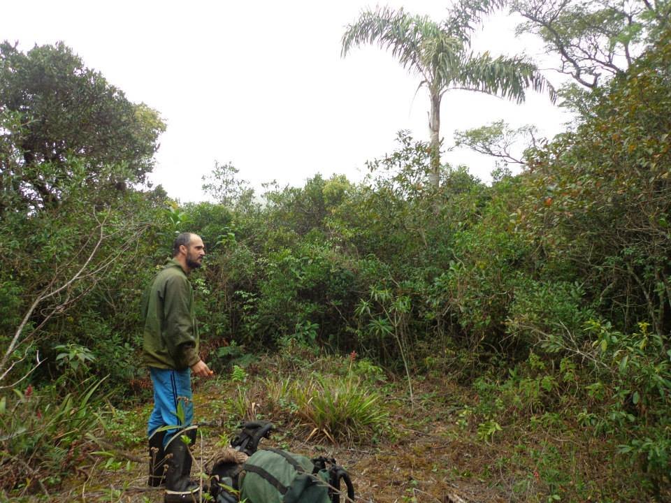 Nessa hora resolvemos que diante da situação era hora de nos agarrarmos em algo mais confiável do que no nosso senso de direção, era hora de apelar para uma invenção milenar, a bússola. Eu sabia, analisando o mapa de satélite, que a Pedra da Guaraiúva estava a 245 graus do topo do Lopo e de agora em diante era para essa direção que deveríamos seguir, já que havíamos notado que não havia mesmo nenhum corredor que pudesse nos levar sem sofrimento para o nosso destino. Ajustei minha bússola, calculei o azimute e fiz os descontos da declinação magnética, que na região é de mais ou menos uns 20 graus e voltamos a enfiar a cara no mato. A sequência da caminhada era o de sempre. Afasta bambu, afasta cipó, cai no buraco, levanta, se arrasta, trepa em pedra, desce da pedra e assim foi, sempre tentando corrigir o rumo dado pela bússola, mas havia horas que tínhamos duvidas da direção dado pelo instrumento e então seguíamos mesmo o nosso instinto, tentando não perder altura e nos mantendo sempre perto do que achávamos que seria a crista da serra. Às 13h20min chegamos a um pequeno descampado, onde uma pequena língua rochosa e um coqueiro solitário nos dava um ótimo local para acampar, mas ainda era muito cedo para isso.