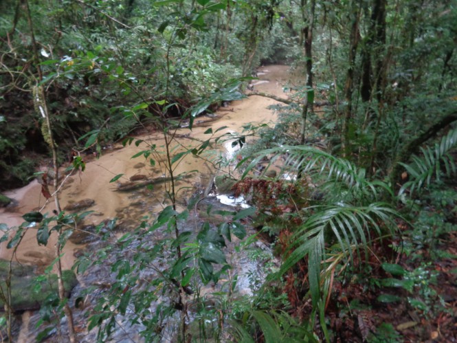 Enfiamos-nos na trilha selva adentro num mato cerrado, mas é uma trilha até um pouco nítida porque deve ser usada por alguns palmiteiros e caçadores. Em menos de meia hora ela nos leva para um rio de leito arenoso, águas cristalinas e de não mais de uns três metros de largura e meio metro de profundidade. Surpreendentemente esse é nada mais nada menos que o próprio Rio Itariru e olha que por intercepta-lo mais de uma hora e meia de onde não passa de meio metro de largura, essa trilha que pegamos, nos fez ganhar uma boa quilometragem. Foi mesmo um grande achado que fizemos na primeira expedição. A trilha atravessa o riacho e se afasta um pouco dele, mas não mais que uns 50 metros. Eu me lembrava de que da outra vez essa mesma trilha seguia para outro vale paralelo ao rio, mas como da outra vez achei que essa trilha estava bem fechada, resolvi pegar uma bifurcação e seguir por outro vestígio de trilha que ia sempre margeando o rio, coisa que nem percebemos da outra vez. Claro que poderíamos ainda nos enfiar no meio do rio e seguir pelas suas águas rasas, mas andar fora é sempre mais rápido e com menos esforço.