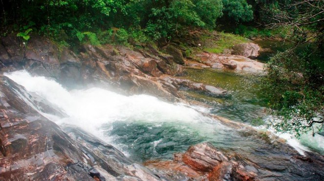 Pulando de pedra em pedra, não demorou muito para a gente chegar numa rampa gigante, onde toda a água do rio foi se desviando pela esquerda, formando um tobogã liso e perigoso. Deitei-me na pedra e fui usando meu corpo todo para conseguir uma boa aderência e cada centímetro parecia fazer diferença e ajudava para que eu não fosse parar no abismo logo a baixo. Cada metro conquistado era comemorado porque via aquele martírio ir chegando ao fim. Engraçado é que eu não lembrava por onde a gente havia descido aquela desgraça da outra vez e só fui perceber o que realmente estava acontecendo quando cheguei ao pé daquela queda e, ao olhar do meu lado esquerdo , ver o afluente em que havíamos ficado travados na primeira expedição. Sem perceber, acabamos descendo pela parte onde um dos integrantes da primeira vez quase foi carregado pela cabeça d’ água. Havíamos vencido o primeiro desafio e para marcar território, resolvemos chamar essa cachoeira de TOBOGÃ DO CÃO, que foi o nome dado pelo Luciano diante da dificuldade e do perigo da descida.